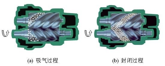 螺桿式空氣壓縮機的工作原理:電機驅動轉子,主從轉子的齒溝空間在轉至進氣端壁開口時,其空間大,外界的空氣充滿其中,當轉子的進氣側端面轉離了殼之進氣口時,在齒溝間的空氣被封閉在主、從轉子與機殼之間,完成吸氣過程。在吸氣結束時,主、從轉子齒峰與機殼形成的封閉容積隨著轉子角度的變化而減少,并按螺旋狀移動,此為壓縮過程。在輸送過程中,容積不斷減少,氣體不斷被壓縮,壓力提高,溫度升高,同時,因氣壓差而變成霧狀的潤滑油被噴入壓縮腔,從而達到壓縮、降低溫度密封和潤滑的作用。當轉子之封閉齒峰旋轉到與機殼排氣口相遇時,被壓縮的空氣開始排放,直到齒峰與齒溝的吻合面移至排氣端面,此時齒溝空間為零,即完成排氣過程。與此同時,主從轉子的另一對齒溝已旋轉至進氣端,形成大空間,開始吸氣過程,由此開始一個新的壓縮循環。